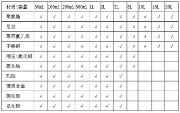 e:刚玉罐属于92%氧化铝烧制,初次使用需用研磨球放至球磨机内将烧结后结晶在罐壁的氧化铝粉慢速抛光可提升耐磨性,可使用有机溶剂,耐酸碱,应用非常广泛.f:硬质合金罐密度较大,容易产生热量,此类罐用在特殊实验.