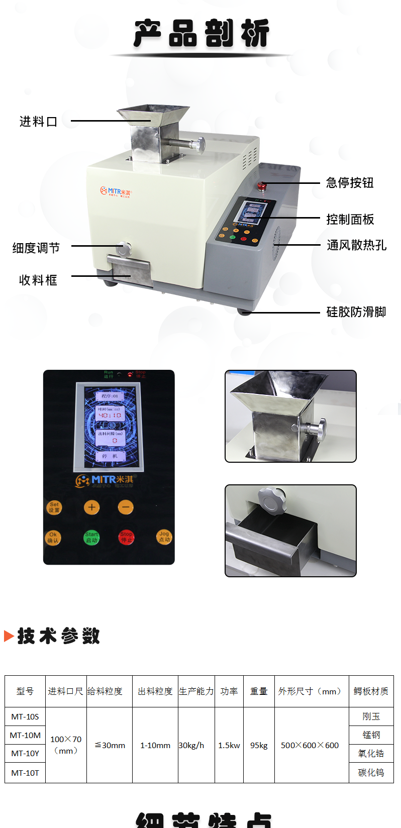 2022新款实验室颚式破碎机参数: 型号MT-10SMT-10MMT-10YMT-10T颚板材质刚玉锰钢氧化锆碳化钨进料口尺寸100*70mm100*70mm100*70mm100*70mm给料粒度≤30mm≤30mm≤30mm≤30mm生产能力1-30kg/h1-30kg/h1-30kg/h1-30kg/h功率0.75kw0.75kw0.75kw0.75kw重量95kg95k