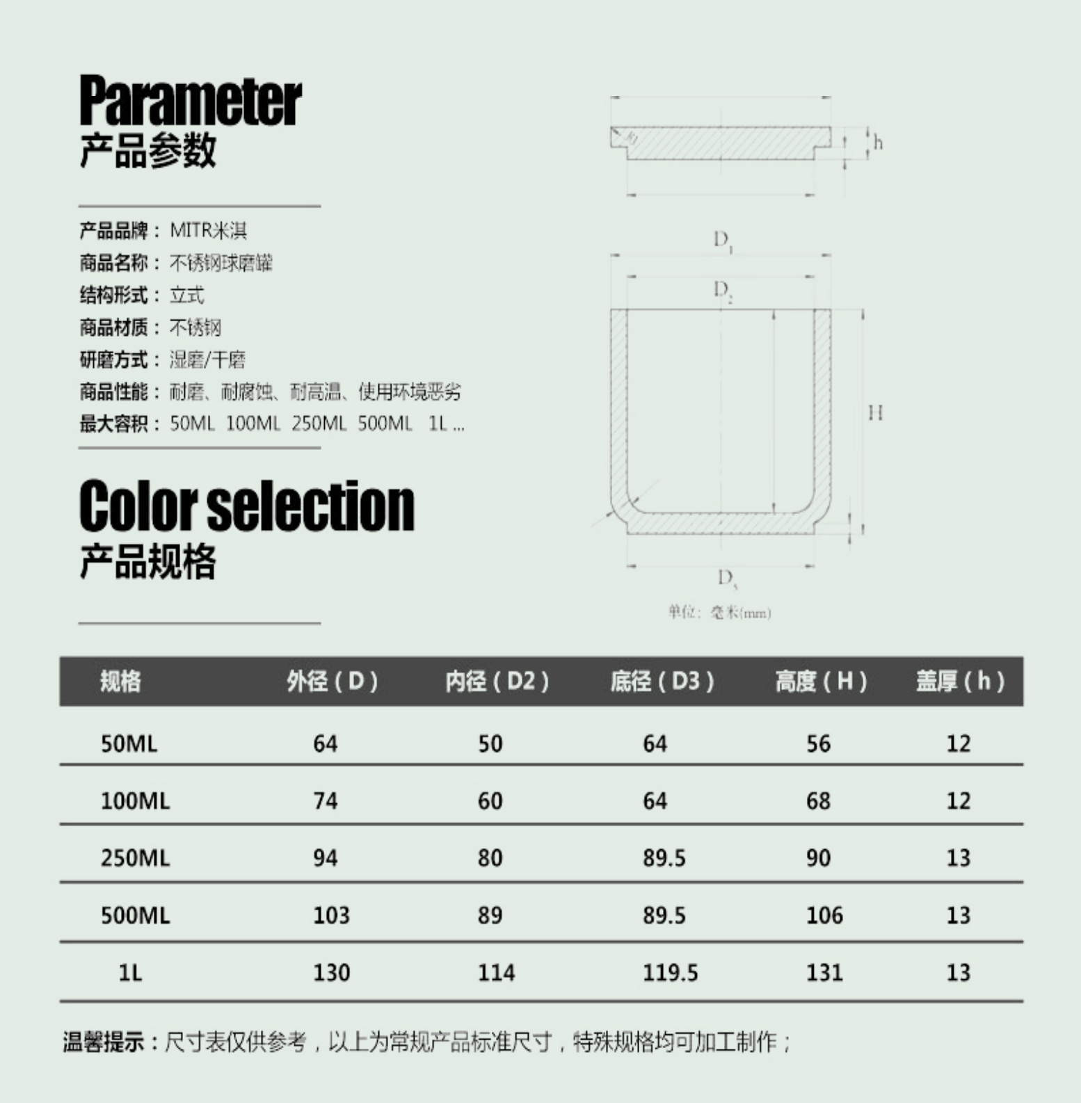 立式行星球磨机不锈钢球磨罐是材料研磨配件中广泛应用的材质罐体。罐体采用不锈钢304材质,耐磨、耐腐蚀、耐高温、适应恶劣环境。高精打磨,内外壁光滑度极高,且底部采用更高制作难度的大R角设计,可有效降低物料在研磨过程中沉底现象。罐口采用更符合人体工程学的抓手台阶,防止手滑,更容易取/放研磨罐。