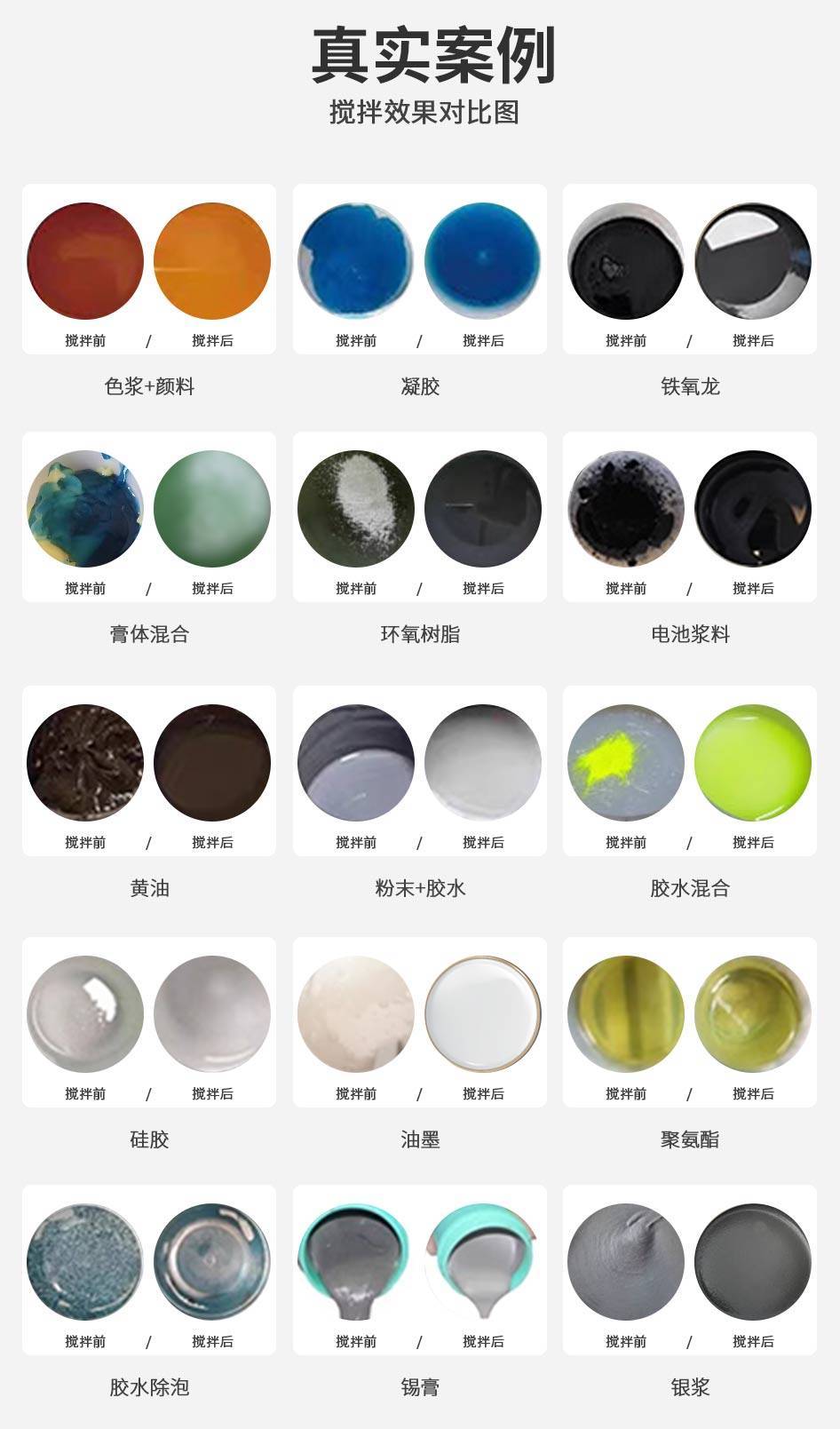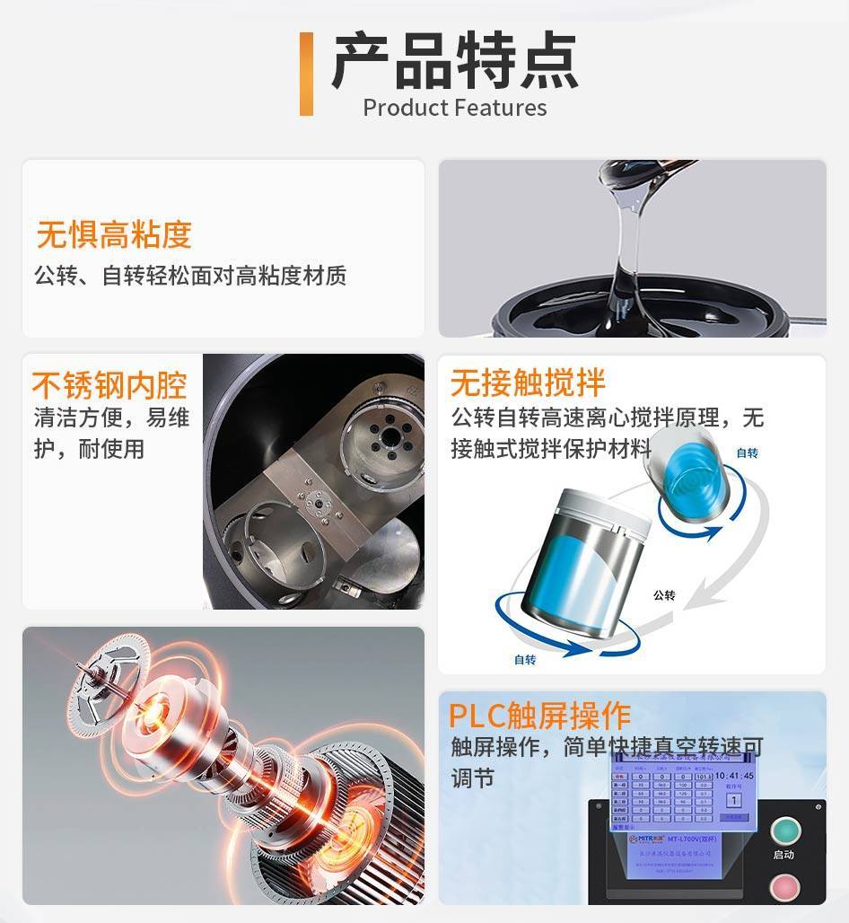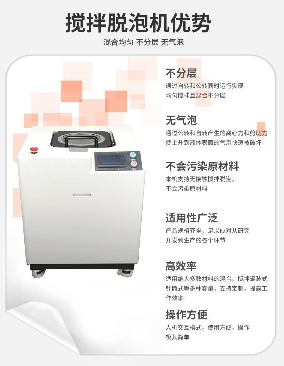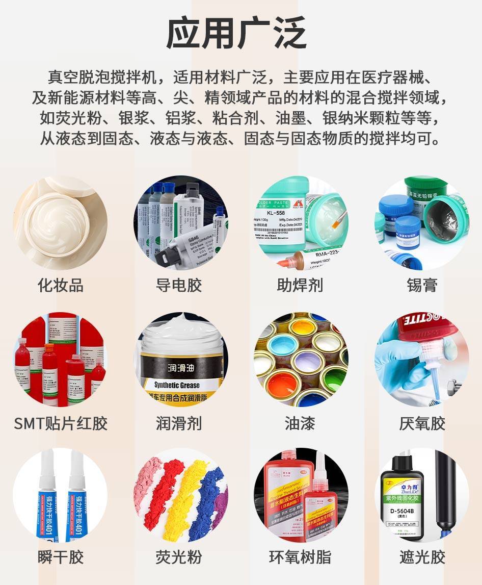 真空脱泡搅拌机适用于化工、医疗器械、新能源材料等高、精、尖领域产品的混合搅拌,广泛应用于荧光粉、银浆、铝浆、粘合剂、油墨、银纳米颗粒等多种材料的处理。实现液态到固态、液态与液态、固态与固态等不同形态物质的均匀搅拌与高效脱泡。