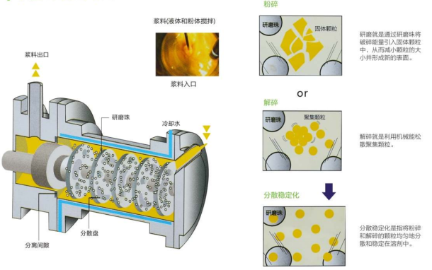 通过在研磨机中与研磨珠一起搅拌来粉碎·分解·分散液体中的粉体(浆料)。